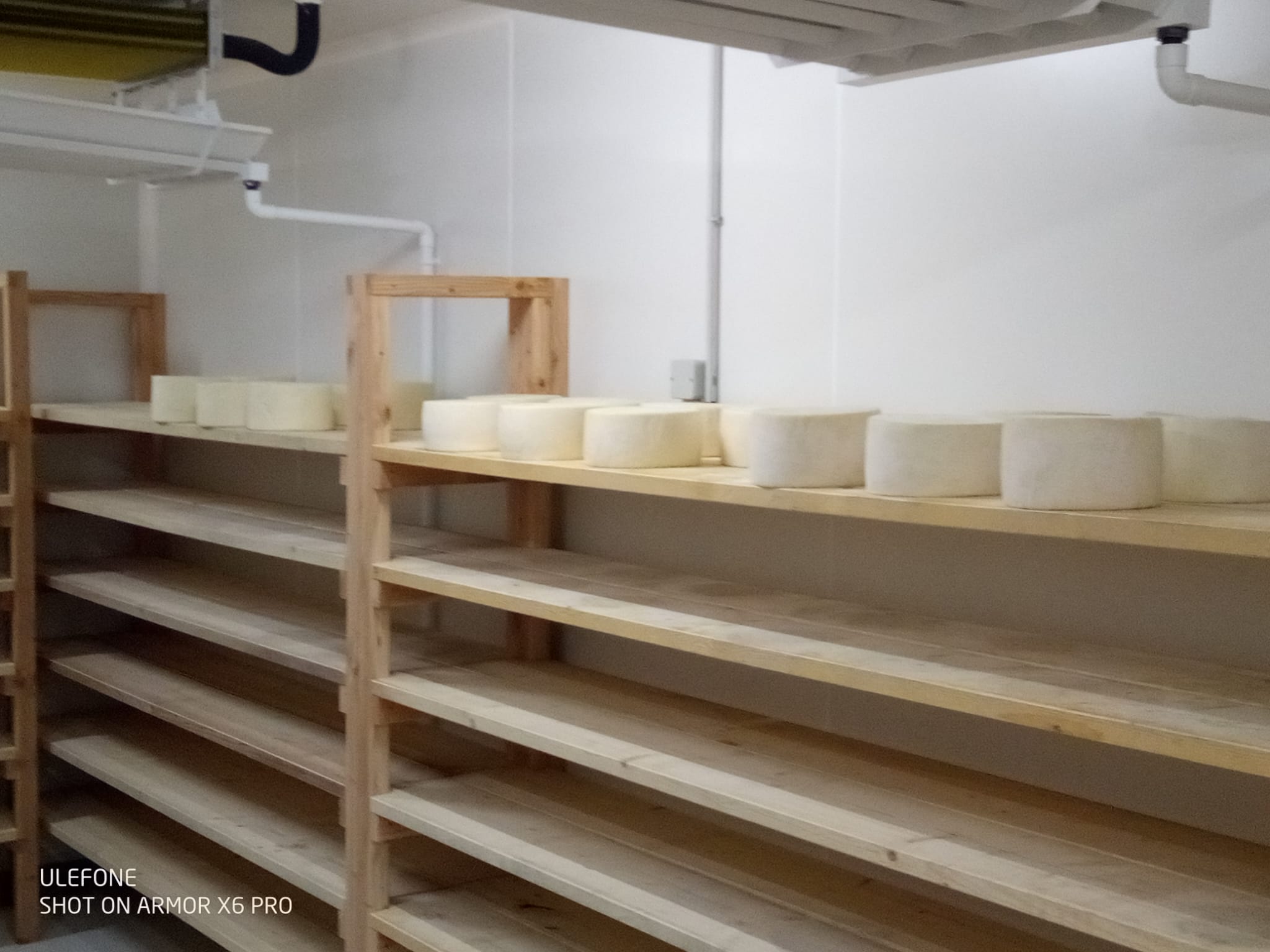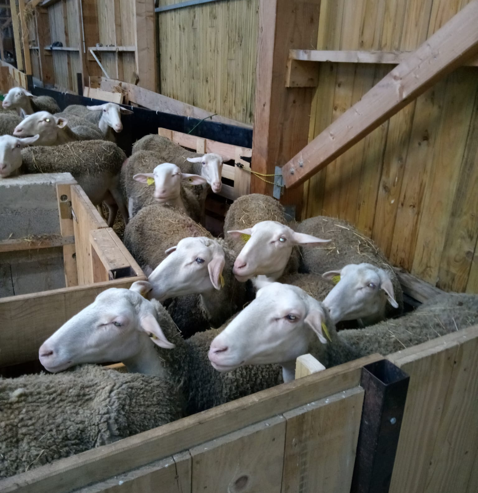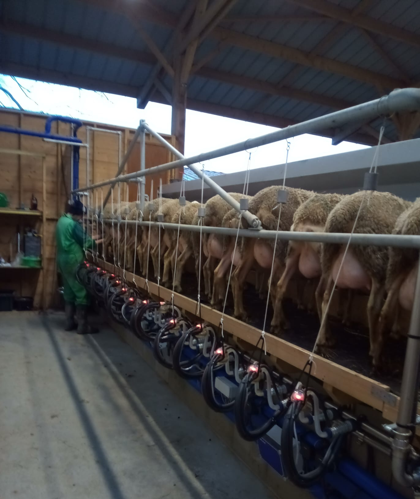 Brebis au pâturage devant la bergerie, 3 mars 2024Les premiers fromages arrivent dans la cave d’affinage, 5 janvier 2023Salle de traite, 15 février 2024